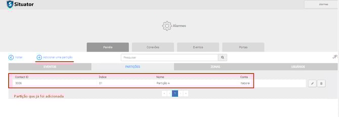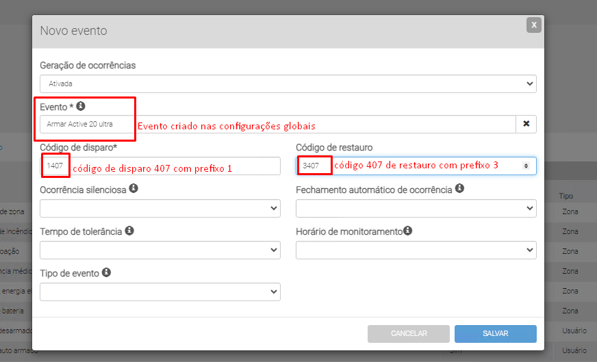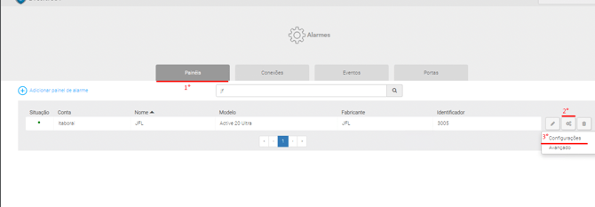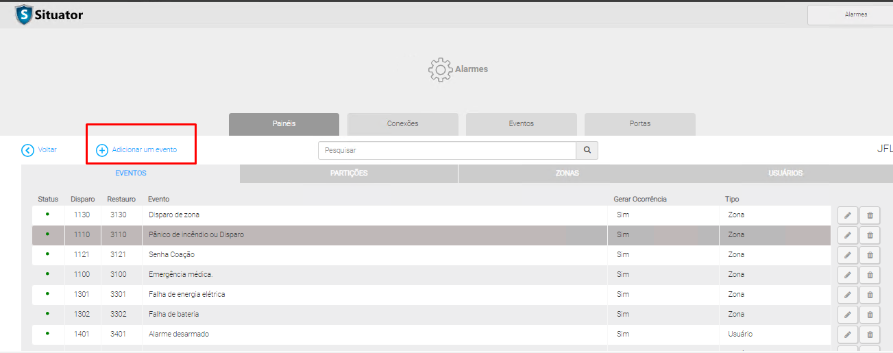 Uma segunda forma de identificar e mapear corretamente os eventos é utilizando a tela de eventos da própria central JFL, facilitando a validação dos códigos enviados.