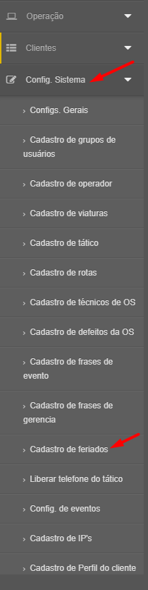 Feito o login no menu você ira na opção "Config.sitemas" e entrara na opção "Cadastro de feriados"