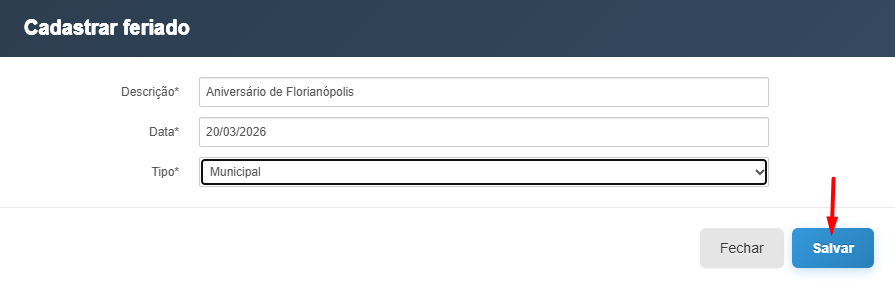 No cadastro de feriado, você irá informar a "descrição do feriado", a "data do feriado" e o "Tipo" no exemplo feito, criei um feriado municipal do aniversário de Florianópolis