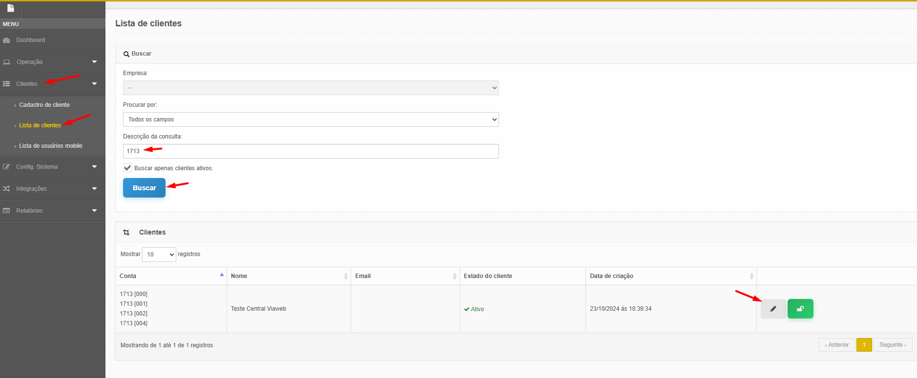 Para isso basta ir em "Clientes - Lista de clientes" no menu do sistema e pesquisar o código da conta que desejas criar a tabela de feriado
