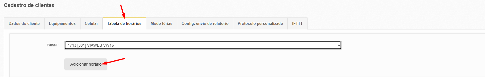 Dentro da conta do cliente você irá na opção "tabela de horários", vai selecionar o "Painel" que desejas criar a tabela de horário e irá clicar em "adicionar horário"