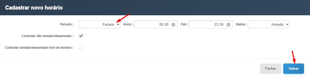 Por fim você irá cadastrar um novo horário, na opção "Período" você irá colocar a opção "Feriado" e irá configurar os horários de inicio e fim do feriado, o restante das configurações você deve solicitar para o cliente informar qual opção o mesmo gostaria de fazer o controle.