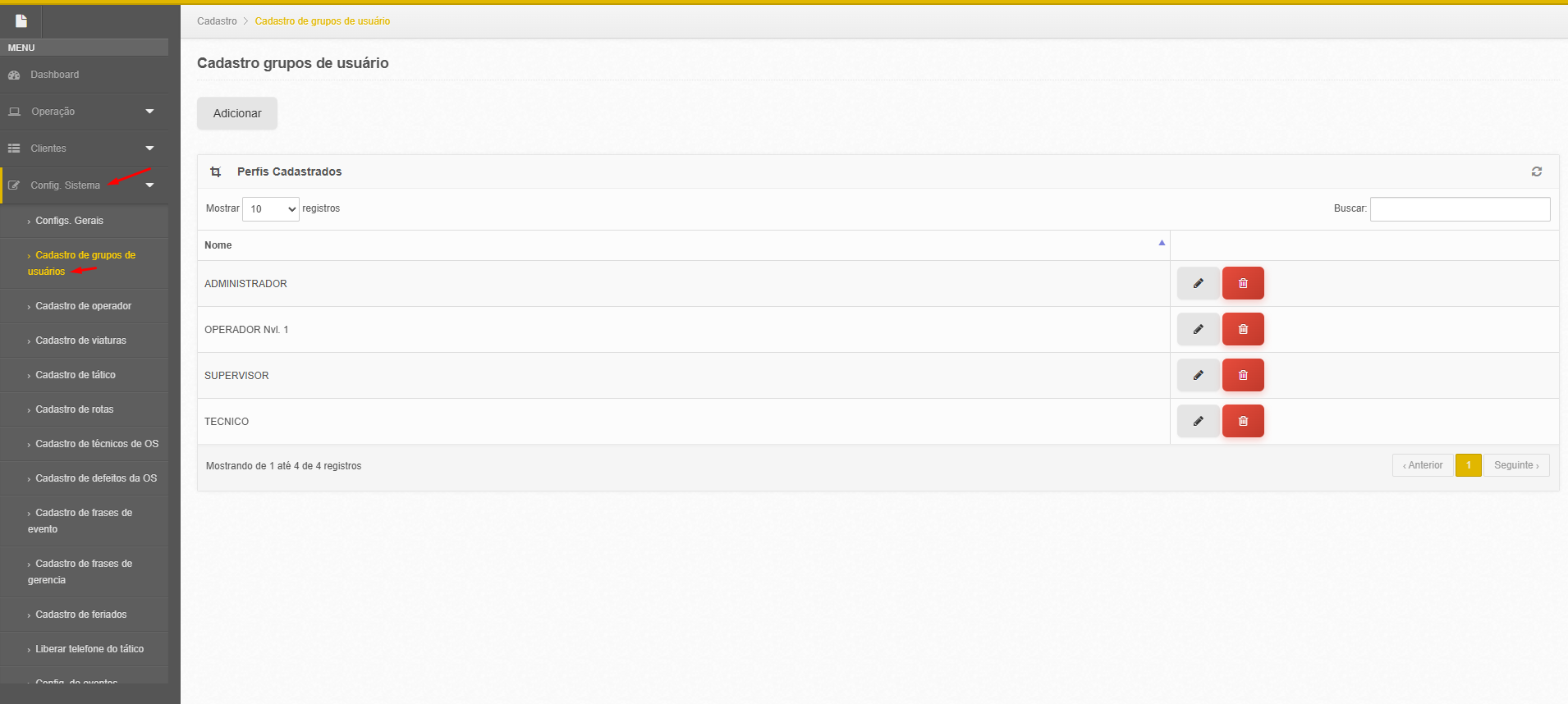 - Acessar opção Config.Sistema -> Cadastro de Grupos de usuários