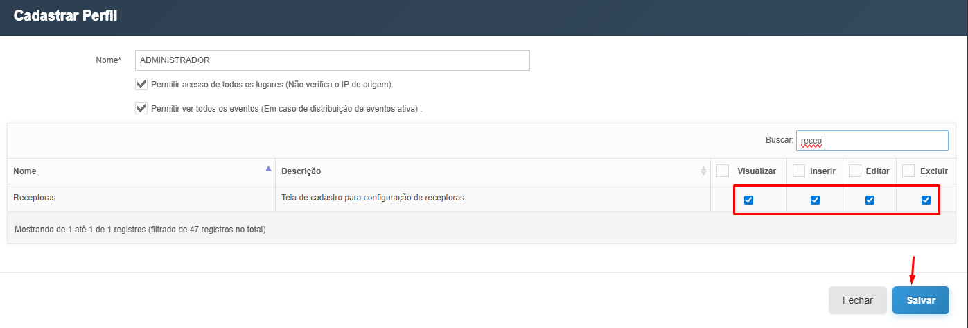 - Pesquise pelo módulo “Receptoras” na barra de pesquisa, ao localizar o módulo, marque/ative as todas de opções de permissão: Visualizar, Inserir, Editar e Excluir.
