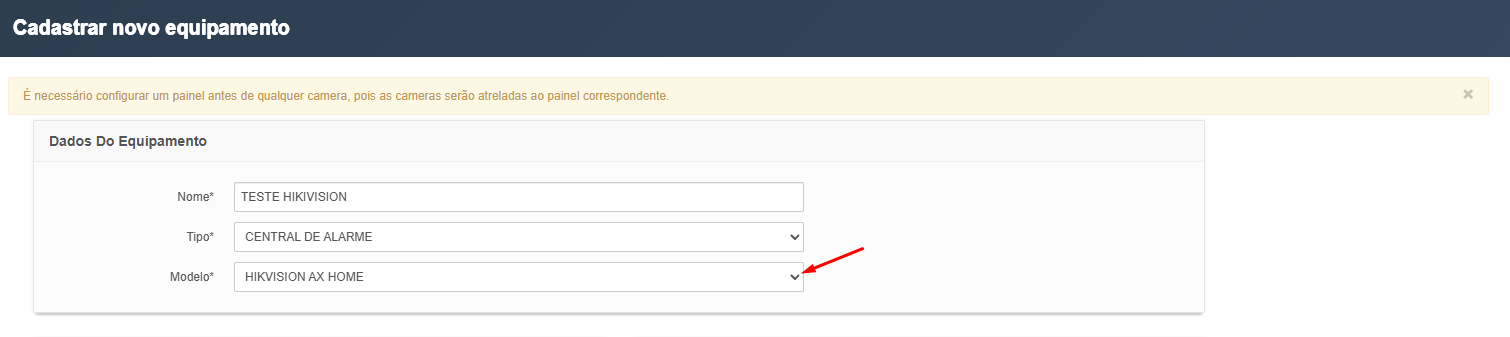 - Ao cadastrar ou editar o equipamento, selecione o modelo Hik-AX Home ou Hik-AX Pro.