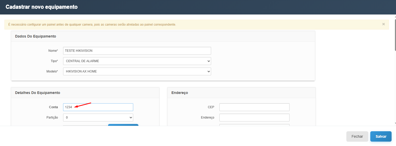 - Informe o número da conta configurada na central Hikvision no campo Conta.