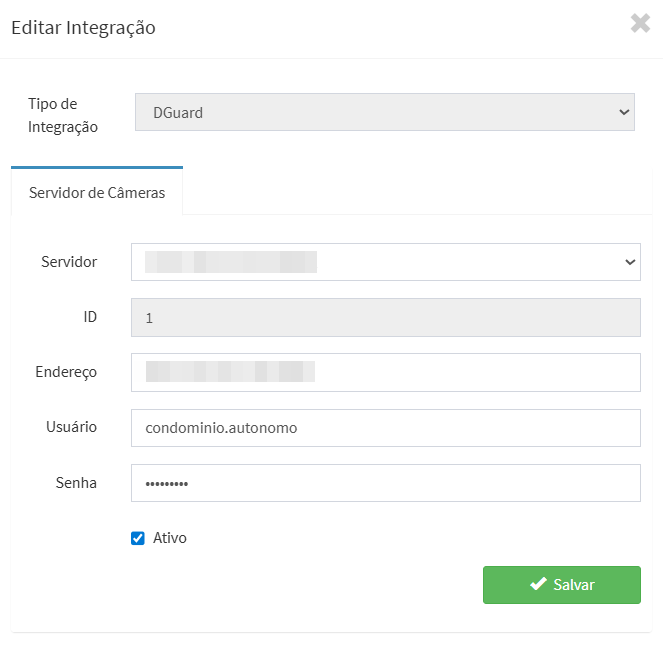 - No campo Tipo de Integração, selecione Servidor DGuard