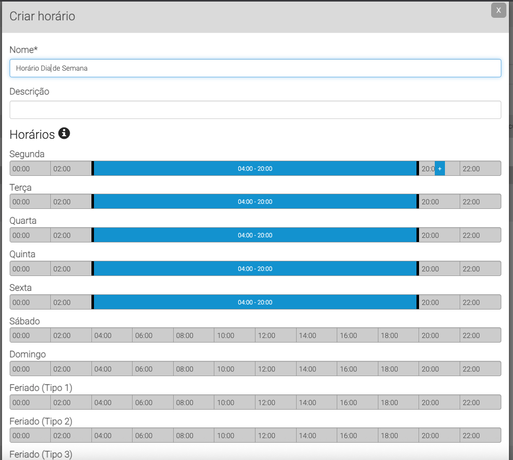 Por exemplo: se for criado um horário chamado Comercial, configurado de segunda a sexta-feira das 09:00 às 18:00, e esse horário for associado a uma zona ou pessoa, o acesso será permitido somente dentro desse período.