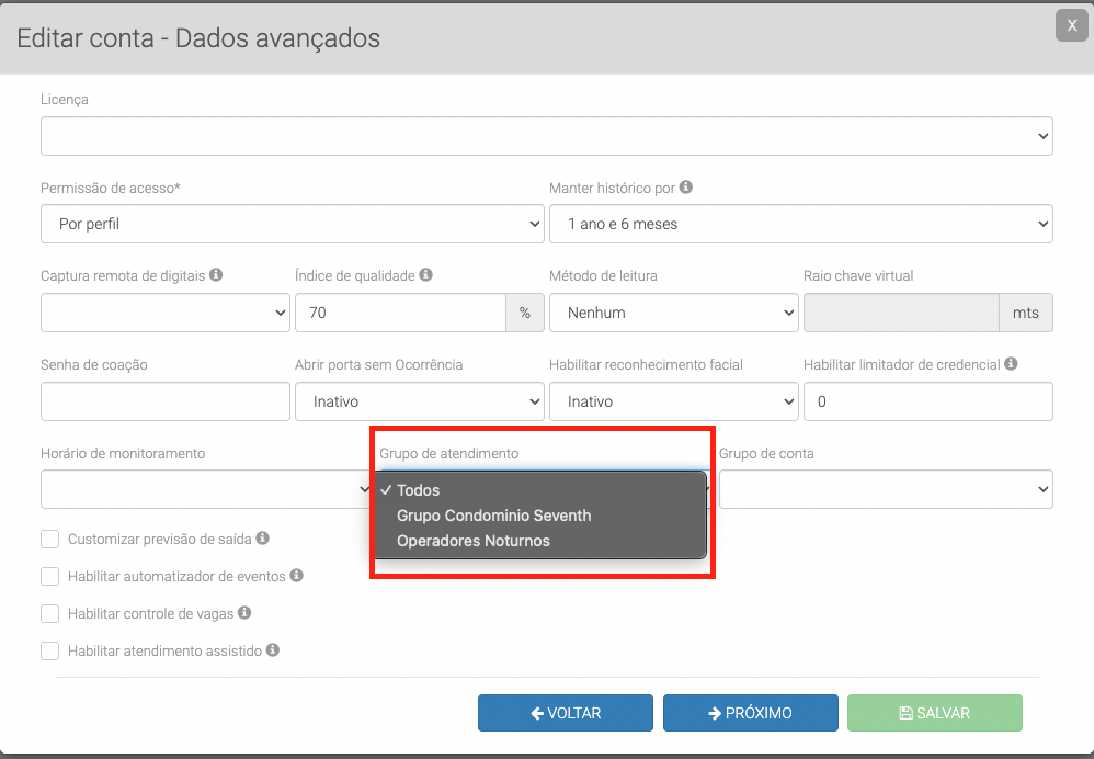 ⚠️ Após a vinculação, somente os operadores pertencentes ao grupo de atendimento selecionado visualizarão as ocorrências desta conta.