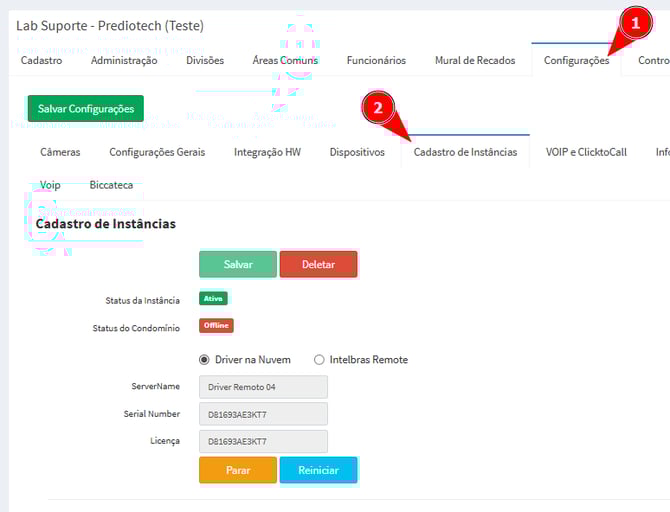 Como Reiniciar o Condomínio na Aba de Cadastro de Instâncias