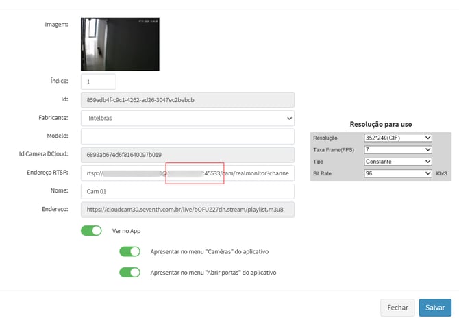 Link RTSP configurado para a câmera.