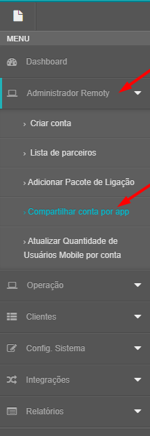 Após se Logar no Sistema, você entrará na aba "Administrador Remoty" - "Compartilhar conta por app"