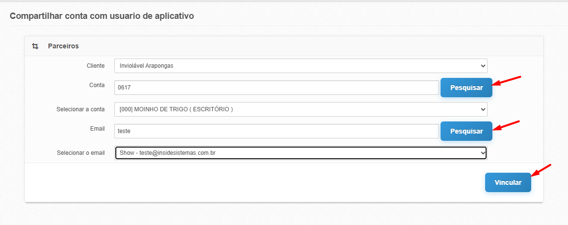 nas opções "Conta" e "E-mail" será preciso confirmar a conta e o e-mail, por fim, basta clicar no botão "Vincular".