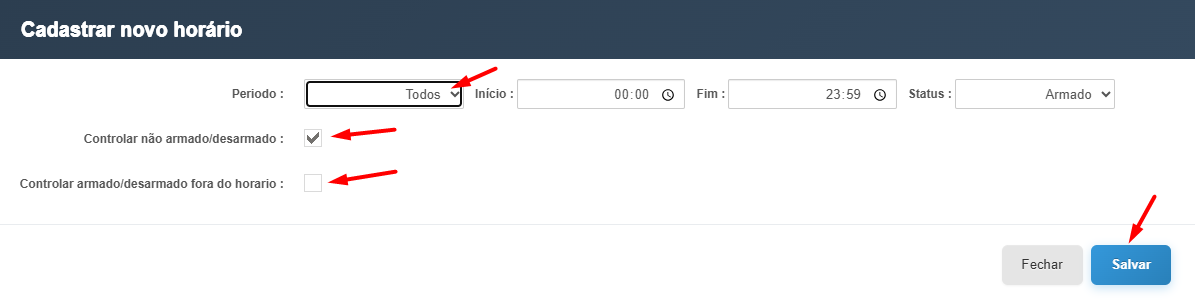 Sempre no inicio do período o sistema irá verificar se a central de alarme está armada. Durante o período, se a central de alarme desarmar o sistema irá alertar sobre o desarme fora de horário.