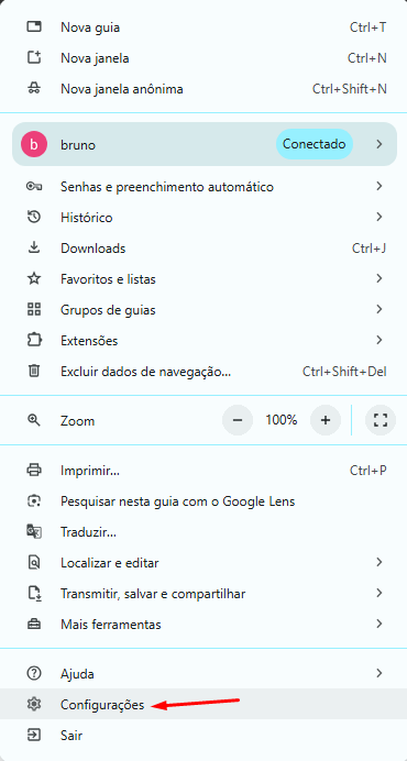 Primeiramente abra as Configurações do navegador através do ícone de menu no canto superior direito