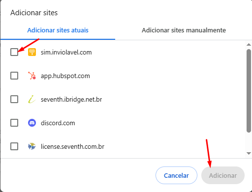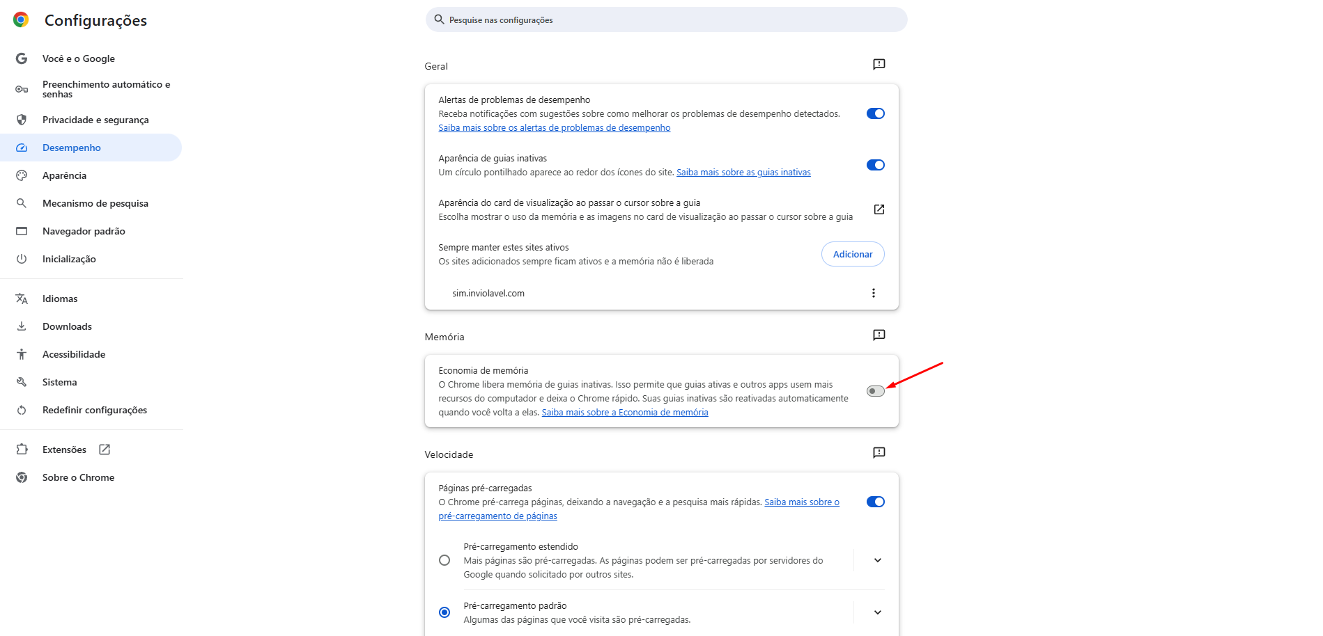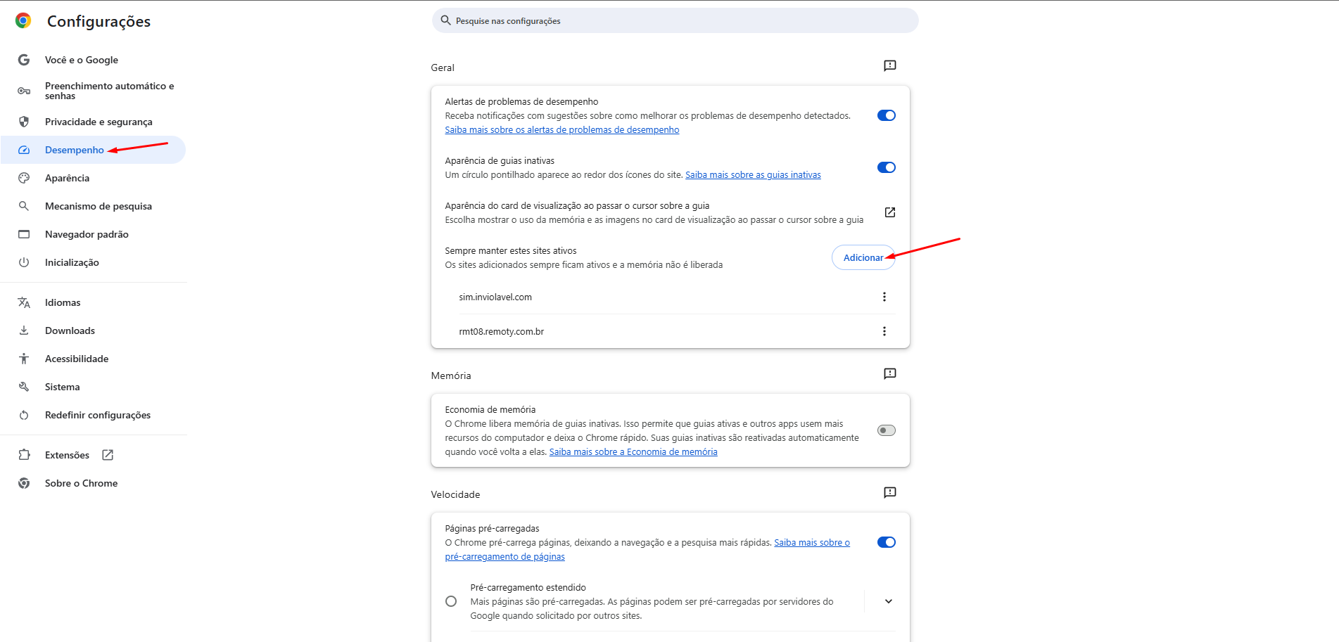 Após entrar em Configurações você entrará na aba "Desempenho", nessa aba você irá localizar a opção "Sempre manter estes sites ativos", você clicará em "Adicionar" e irá adicionar o sistema "sim.inviolavel.com"