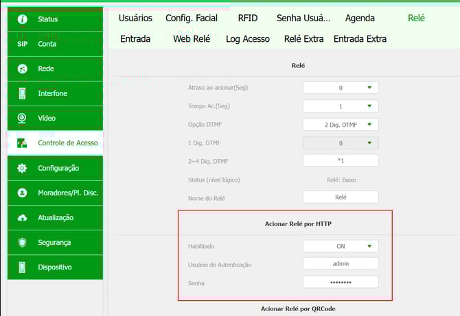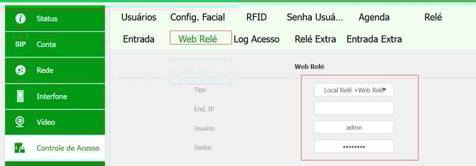 No menu Controle de Acesso, selecione Web Relé.