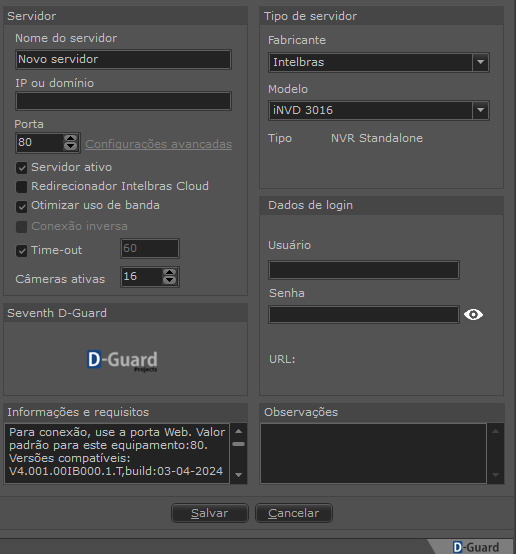 O cadastro do equipamento é realizado da mesma forma que qualquer outro equipamento no servidor D-Guard conforme imagens abaixo: