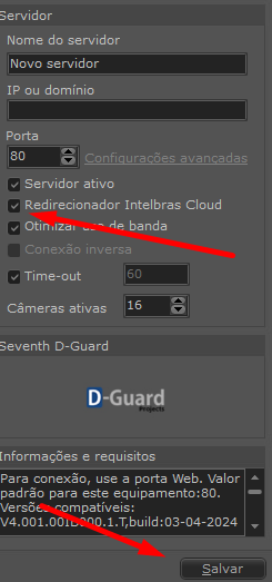 Primeiro ative o Redirecionador Inntelbras Cloud depois Servidor Ativo, e em seguida, Salvar.