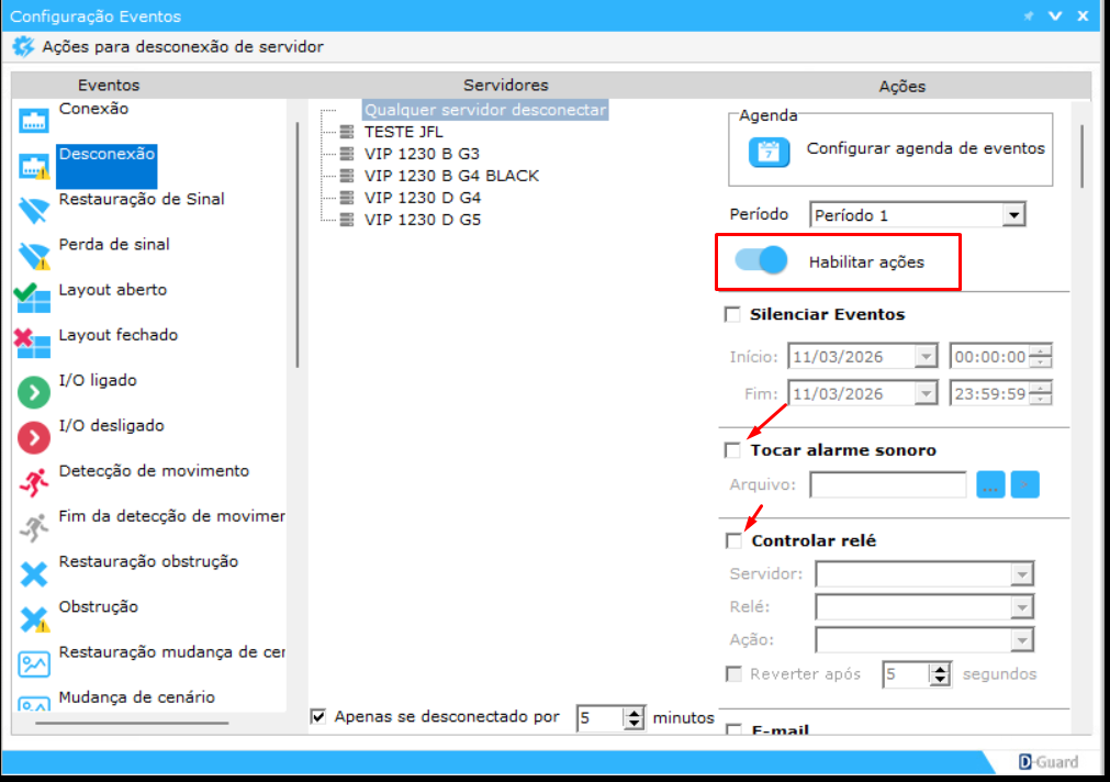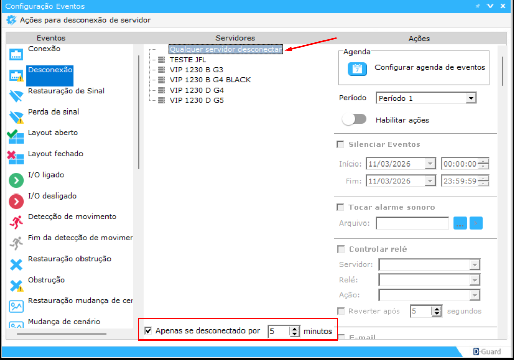 No evento Desconexão, a opção Qualquer servidor desconectar permite definir o tempo que o D-Guard aguardará antes de executar a ação configurada.