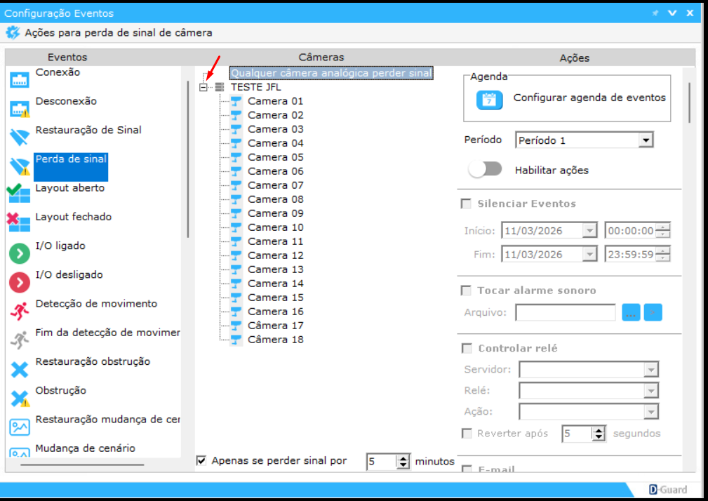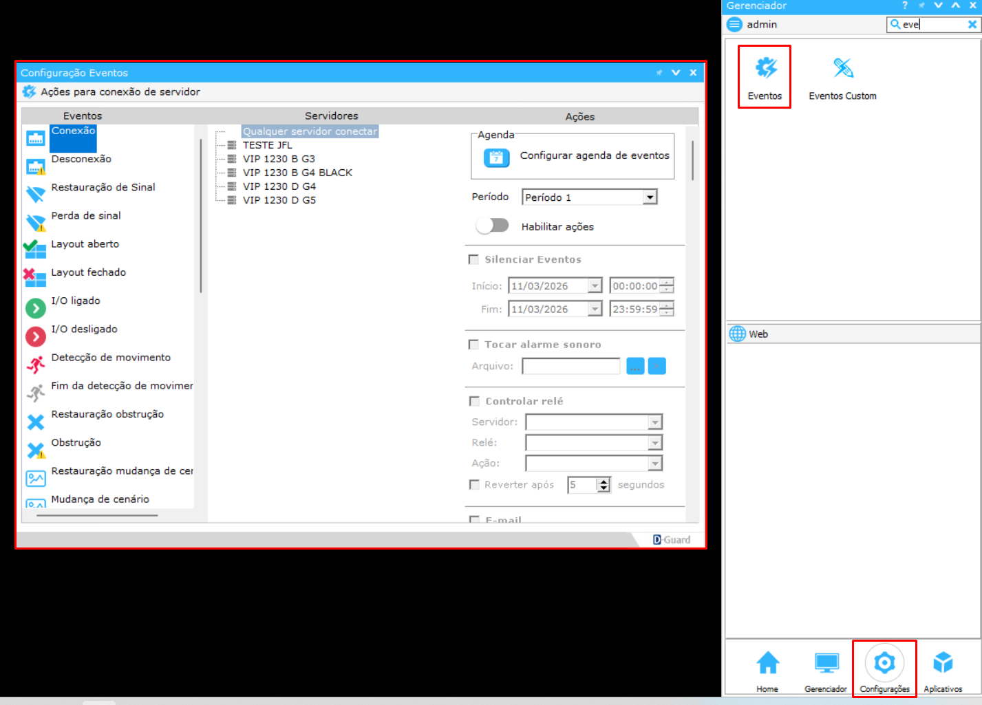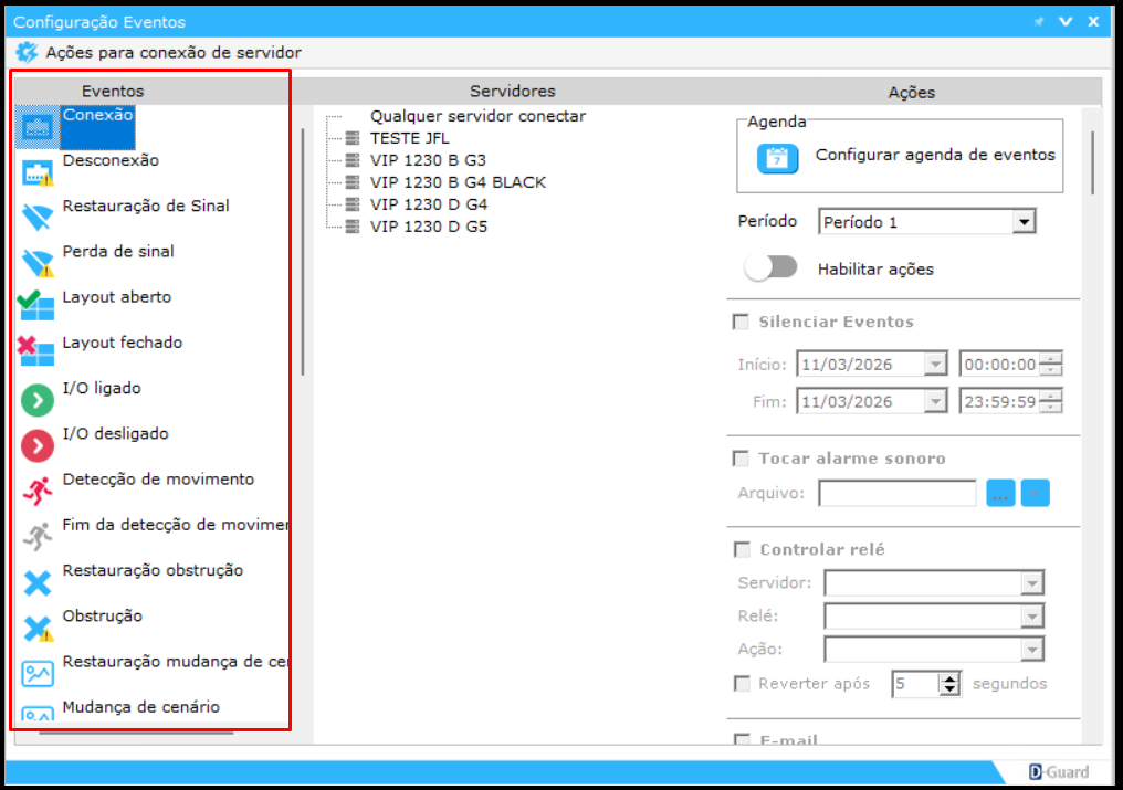 Configurar eventos no D-Guard para que o sistema execute ações automáticas, como abertura de layout, envio de e-mail ou disparo de alarme, quando um gatilho for detectado.