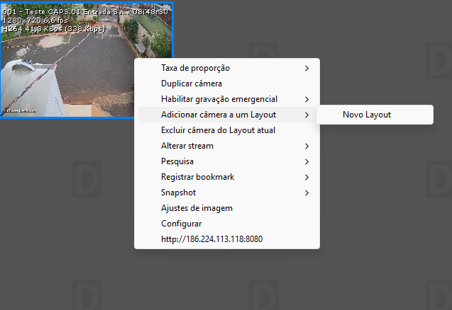 1) Através do menu Gerenciador do DGuard, seja pela lista de Servidores ou pelos Layouts, Clique no botão "+" para expandir as câmeras, botão direito na câmera desejada -> Adicionar câmera à um Layout -> Escolher "Novo layout" ou algum já existente.