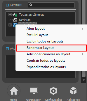 Também pode ser feito de dentro de um Layout já existente, clicando com o botão direito na imagem ao vivo da câmera em questão -> Adicionar câmera à um Layout -> Escolher "Novo layout" ou algum já existente ou na lista de layouts já existentes na aba Home: