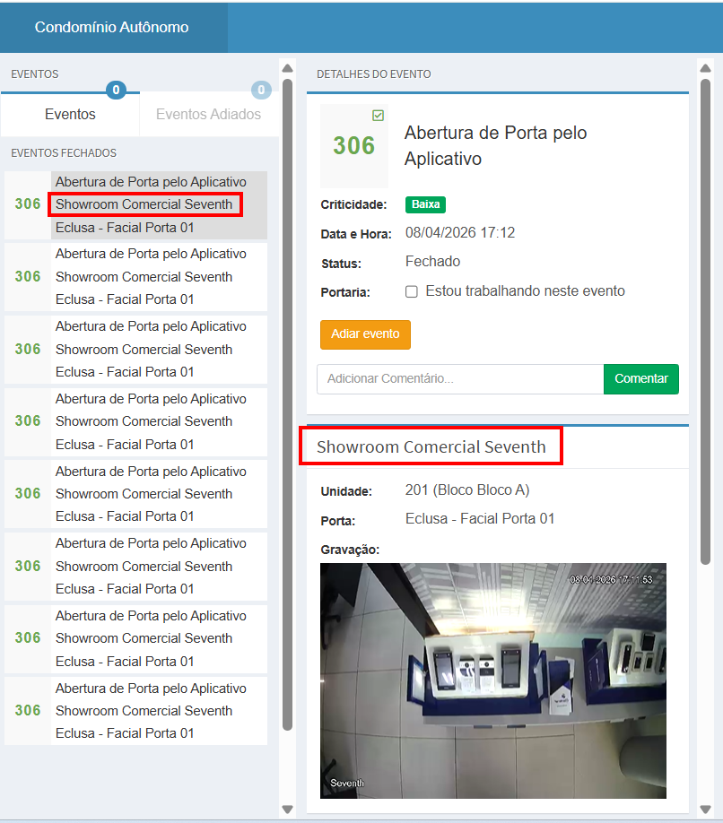 A tela de Visualização de Eventos é automaticamente atualizada com o condomínio referente ao evento: