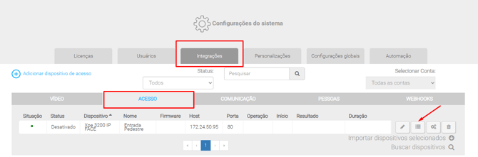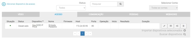 O dispositivo de acesso é exibido no sistema com o status Desativado, impedindo sua utilização e sincronização.
