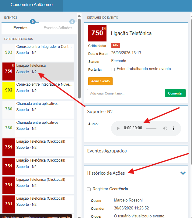 Esse comportamento garante rastreabilidade e controle das interações realizadas via comunicação VoIP dentro do Gerenciamento de Eventos.