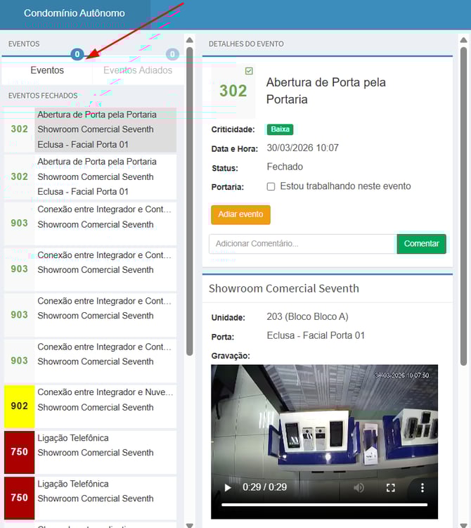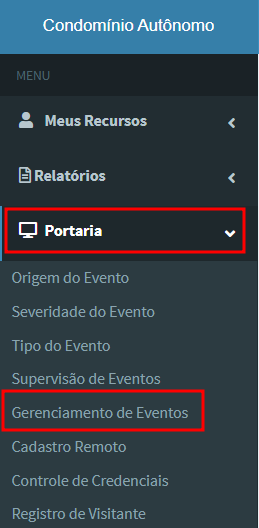 O recurso está disponível no ambiente de Condomínio Autônomo e Portaria na Nuvem e é acessado a partir do menu Portaria -> Gerenciamento de Eventos, sendo direcionado exclusivamente para a operação do porteiro.