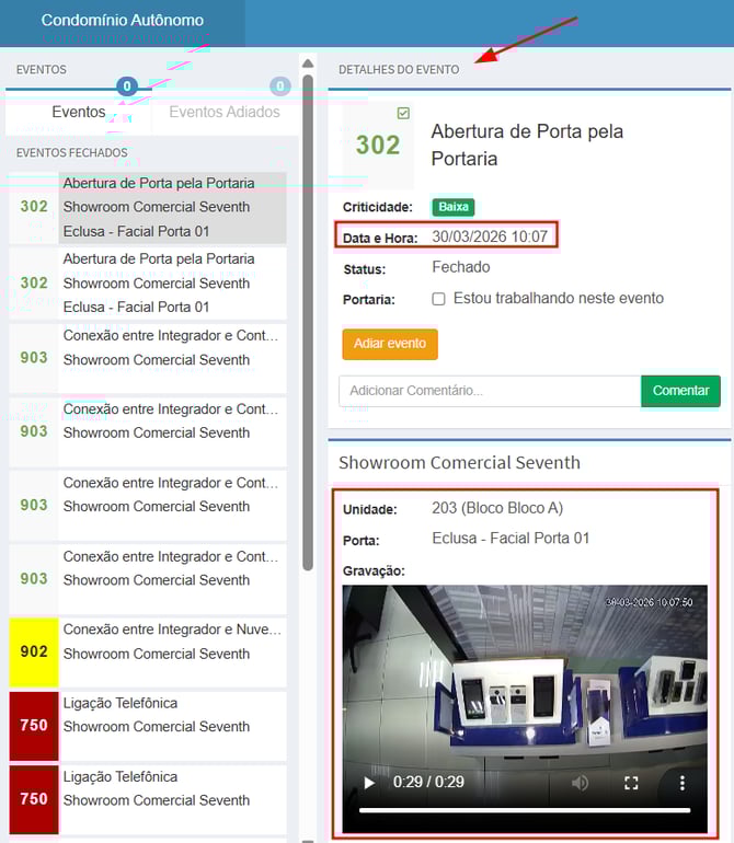 Exibe as informações completas do evento selecionado, como descrição, data e hora, criticidade, status, gravação do recorte do vídeo - por padrão é 30 segundos, e interações realizadas durante o atendimento.