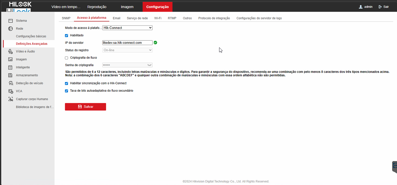 - Diretamente no DVR, para isso, a cesse a interface de "Configurações de Rede": "Menu - Configuration - Network"; s elecione a opção "Plataform Access" e desmarque a opção "Enable Stream Encryption"