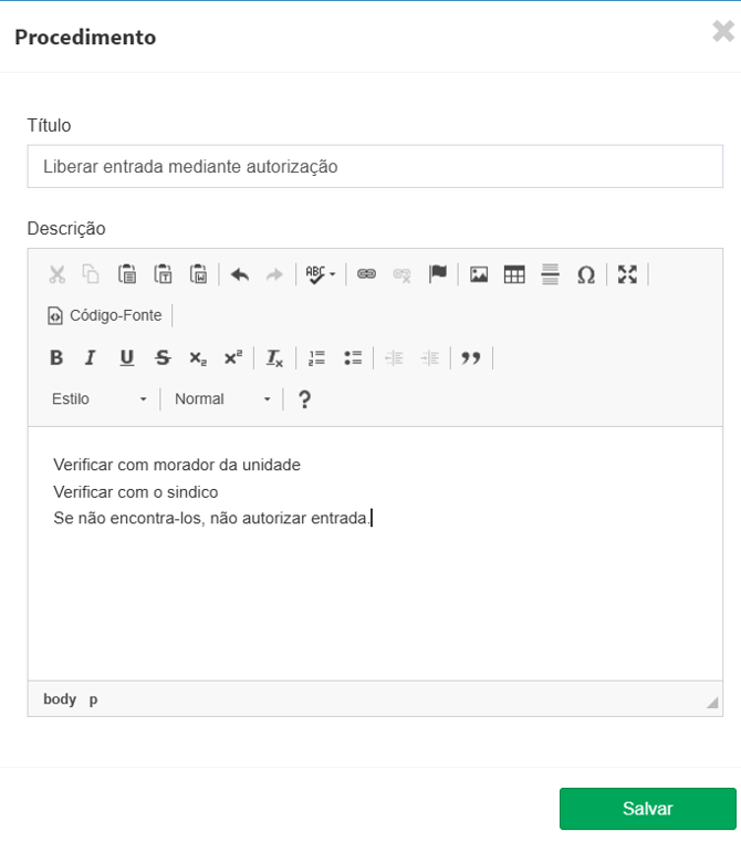 Preencha o titulo que descreva o procedimento e no campo Descrição, adicione a lista de tarefas ou informações importantes para o procedimento.