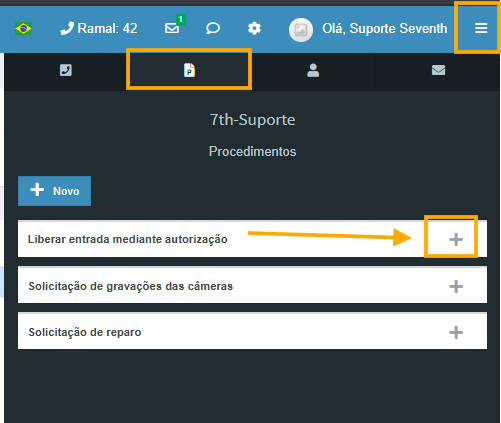Acesse o menu no canto superior direito (3 barras), da lista, acesse o ícone dos procedimentos ( P ), da lista de procedimentos clique em (+) do procedimento desejado.