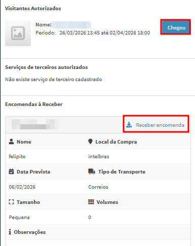 ℹ️ Em Visitantes autorizados, Serviços de terceiros autorizados e Encomendas à receber é possível informar se o visitante ou terceiro chegou e se a encomenda foi recebida.