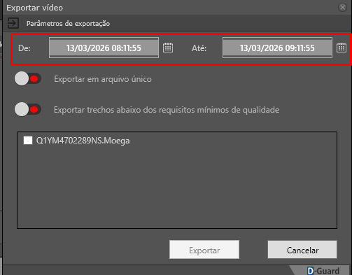 Defina a Data e Hora inicial e final do vídeo que será exportado.