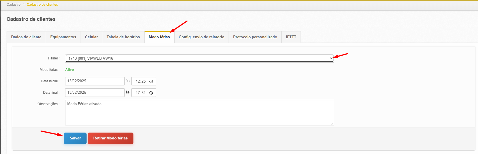 Após entrar na edição da Conta você selecionará a aba "Modo Férias", nessa parte você precisa selecionar o Painel do cliente, após isso você vai informar tanto a "Data de Inicio" quanto a "Data de Final" do Período de Férias, Por fim, informe o máximo de Informações importantes no campo "Observações", Salve a configuração!